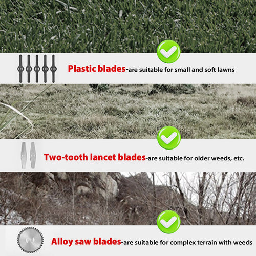 FEATURES: Multifunctional 3 in 1 grass trimmer: 6 inches saw blades for trimming thick shrub branches/heavy bushes (a thickness of about 1-2 inches), stainless steel blades...