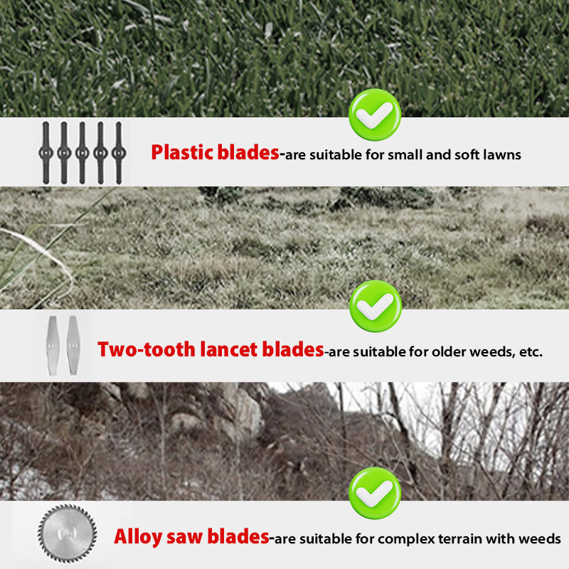Multifunctional 3 in 1 grass trimmer: 6 inches saw blades for trimming thick shrub branches/heavy bushes (a thickness of about 1-2 inches), stainless steel blades that are well for older weeds, reeds, etc pruning, plastic blades are suitable for soft lawn mowing, durable metal blade allows you to cut through dense vegetation and grass in less.